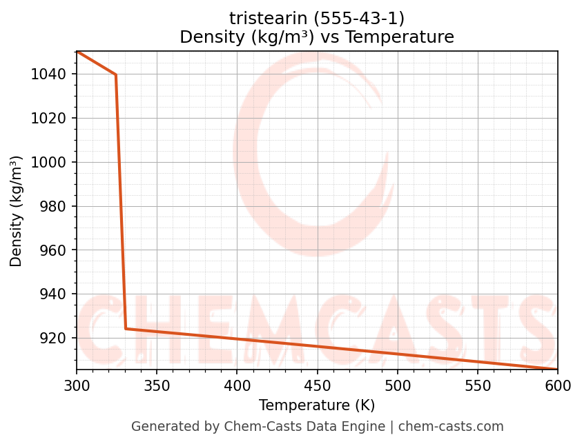 This page presents the temperature-dependent thermodynamic and transport properties of tristearin (CAS 555-43-1) calculated at a constant pressure of 1 atm (101325 Pa) over the temperature range 250-500 K.