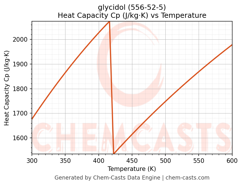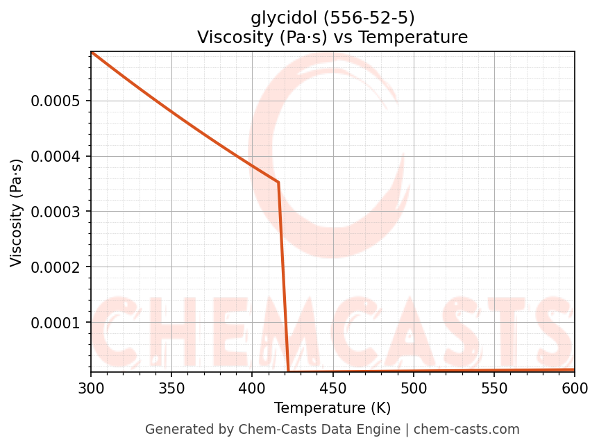 This page presents the temperature-dependent thermodynamic and transport properties of glycidol (CAS 556-52-5) calculated at a constant pressure of 1 atm (101325 Pa) over the temperature range 250-500 K.