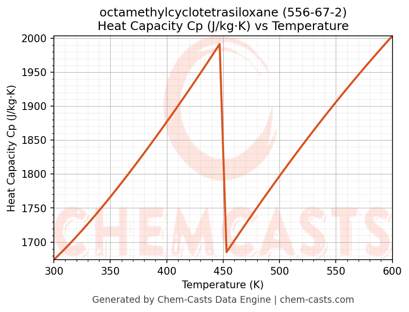 - Specific heat capacity (Cp) indicates the amount of energy required to raise the temperature of octamethylcyclotetrasiloxane and is critical for energy balance and heat-exchanger design.