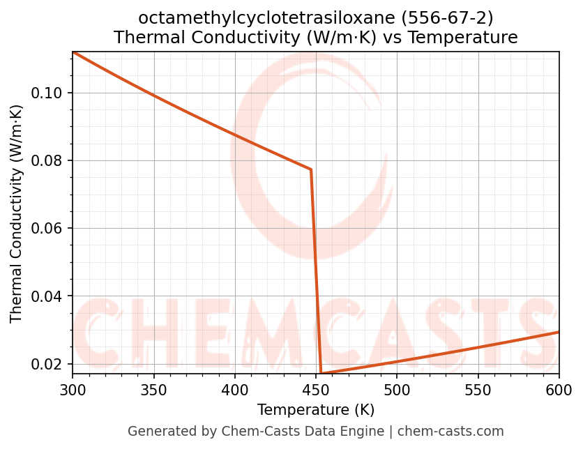 This page presents the temperature-dependent thermodynamic and transport properties of octamethylcyclotetrasiloxane (CAS 556-67-2) calculated at a constant pressure of 1 atm (101325 Pa) over the temperature range 250-500 K.