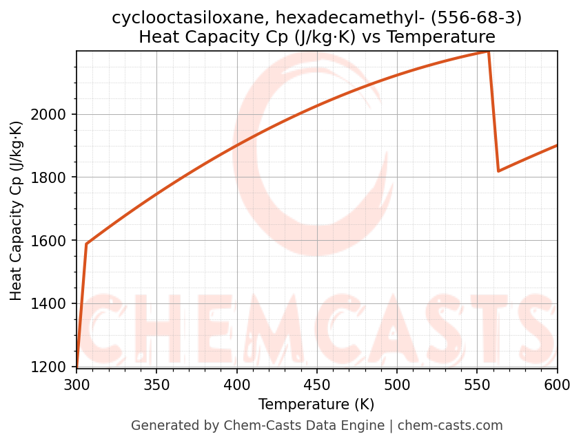 - Specific heat capacity (Cp) indicates the amount of energy required to raise the temperature of cyclooctasiloxane, hexadecamethyl- and is critical for energy balance and heat-exchanger design.