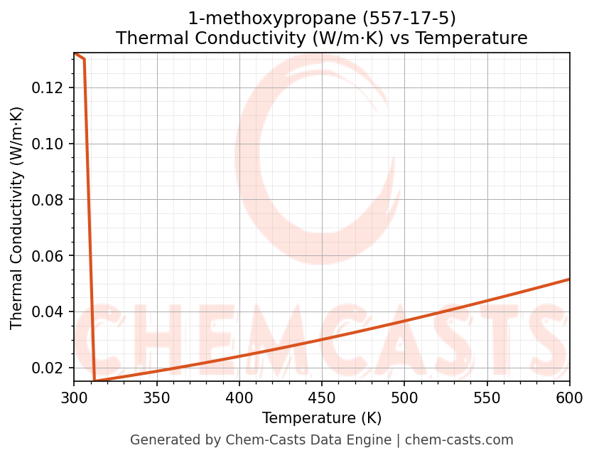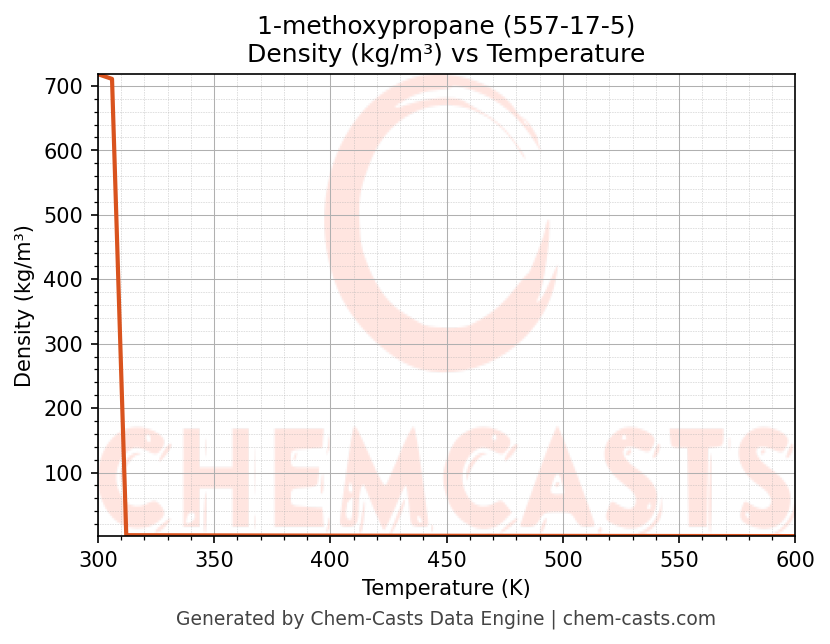 This page presents the temperature-dependent thermodynamic and transport properties of 1-methoxypropane (CAS 557-17-5) calculated at a constant pressure of 1 atm (101325 Pa) over the temperature range 250-500 K.
