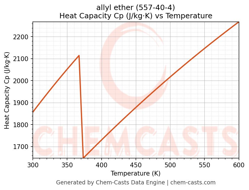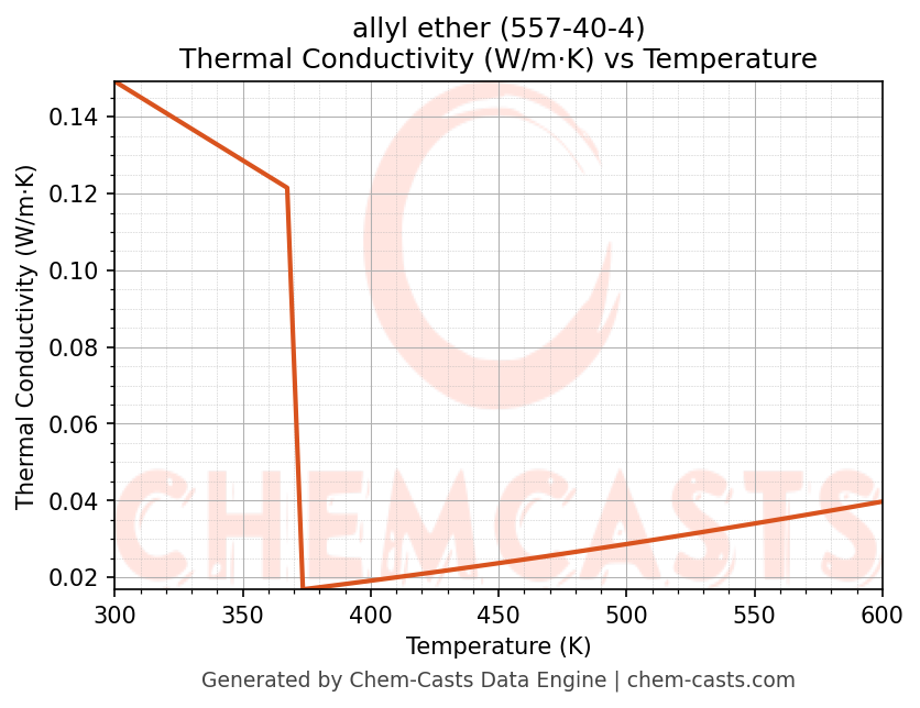 This page presents the temperature-dependent thermodynamic and transport properties of allyl ether (CAS 557-40-4) calculated at a constant pressure of 1 atm (101325 Pa) over the temperature range 250-500 K.