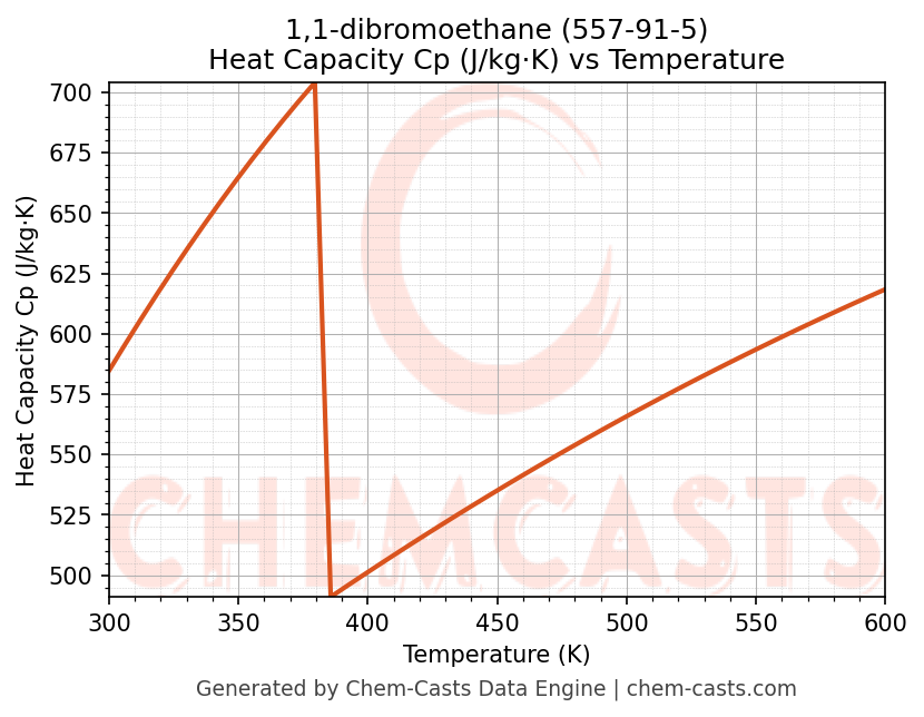 - Specific heat capacity (Cp) indicates the amount of energy required to raise the temperature of 1,1-dibromoethane and is critical for energy balance and heat-exchanger design.