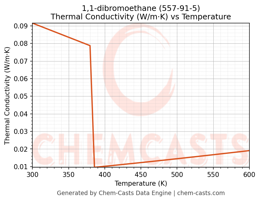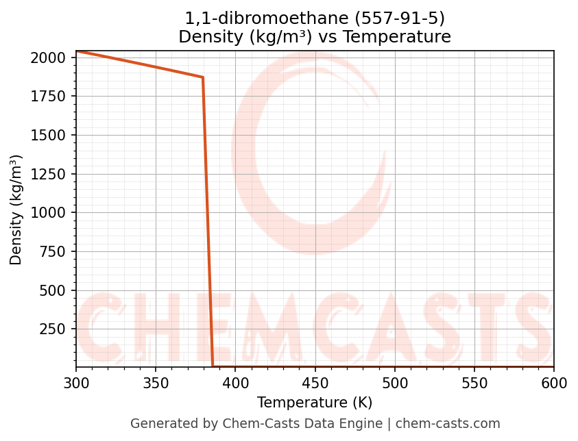 This page presents the temperature-dependent thermodynamic and transport properties of 1,1-dibromoethane (CAS 557-91-5) calculated at a constant pressure of 1 atm (101325 Pa) over the temperature range 250-500 K.