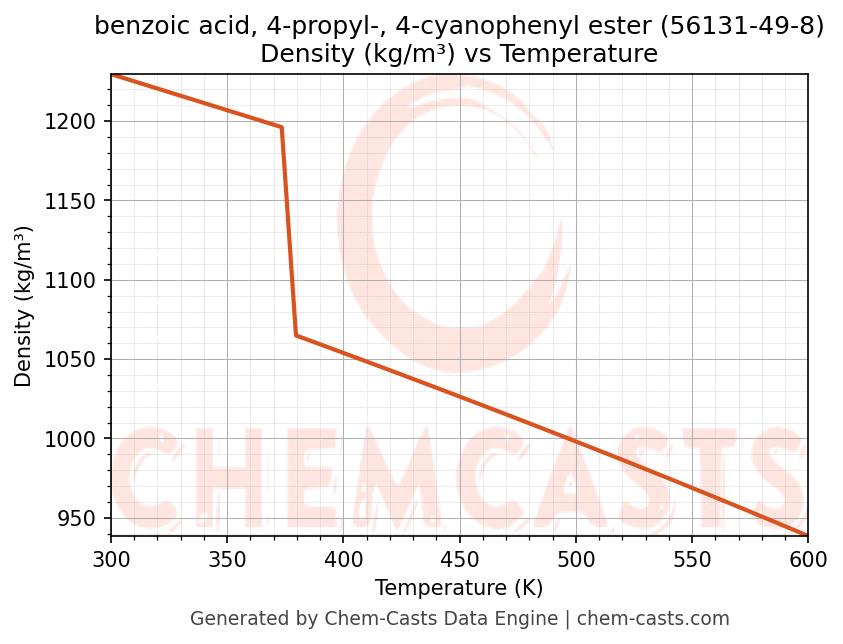 This page presents the temperature-dependent thermodynamic and transport properties of benzoic acid, 4-propyl-, 4-cyanophenyl ester (CAS 56131-49-8) calculated at a constant pressure of 1 atm (101325 Pa) over the temperature range 250-500 K.