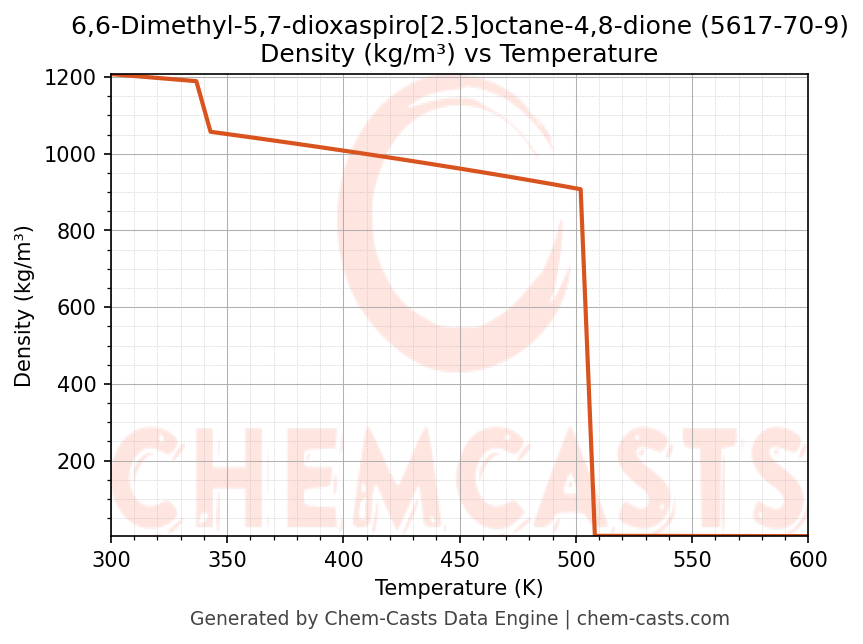 ![Density vs Temperature chart for 6,6-Dimethyl-5,7-dioxaspiro[2.5]octane-4,8-dione (CAS 5617-70-9)](https://chemcasts-prod.s3.ap-south-1.amazonaws.com/chem_plots_pconst/5617-70-9-density.png)