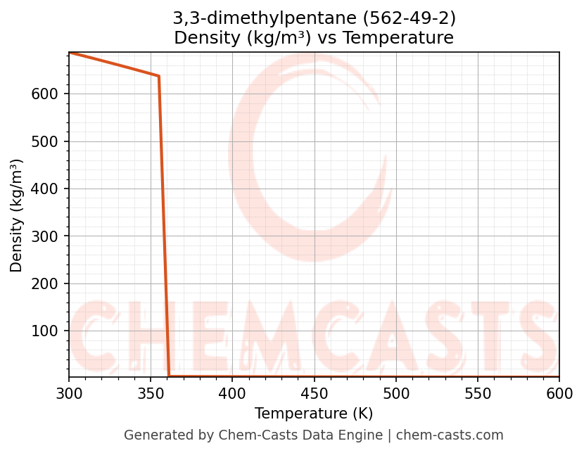 This page presents the temperature-dependent thermodynamic and transport properties of 3,3-dimethylpentane (CAS 562-49-2) calculated at a constant pressure of 1 atm (101325 Pa) over the temperature range 250-500 K.