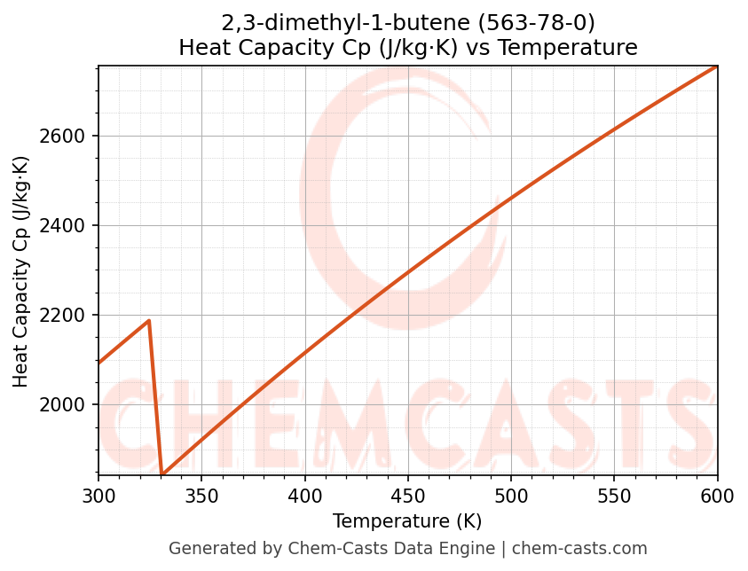 - Specific heat capacity (Cp) indicates the amount of energy required to raise the temperature of 2,3-dimethyl-1-butene and is critical for energy balance and heat-exchanger design.