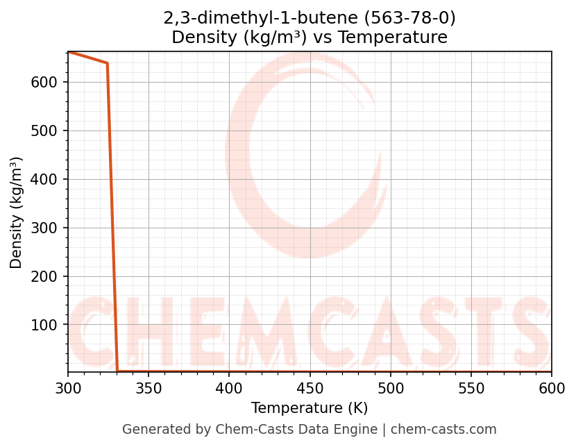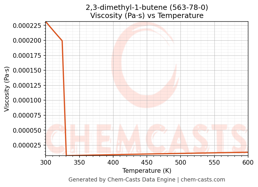 This page presents the temperature-dependent thermodynamic and transport properties of 2,3-dimethyl-1-butene (CAS 563-78-0) calculated at a constant pressure of 1 atm (101325 Pa) over the temperature range 250-500 K.