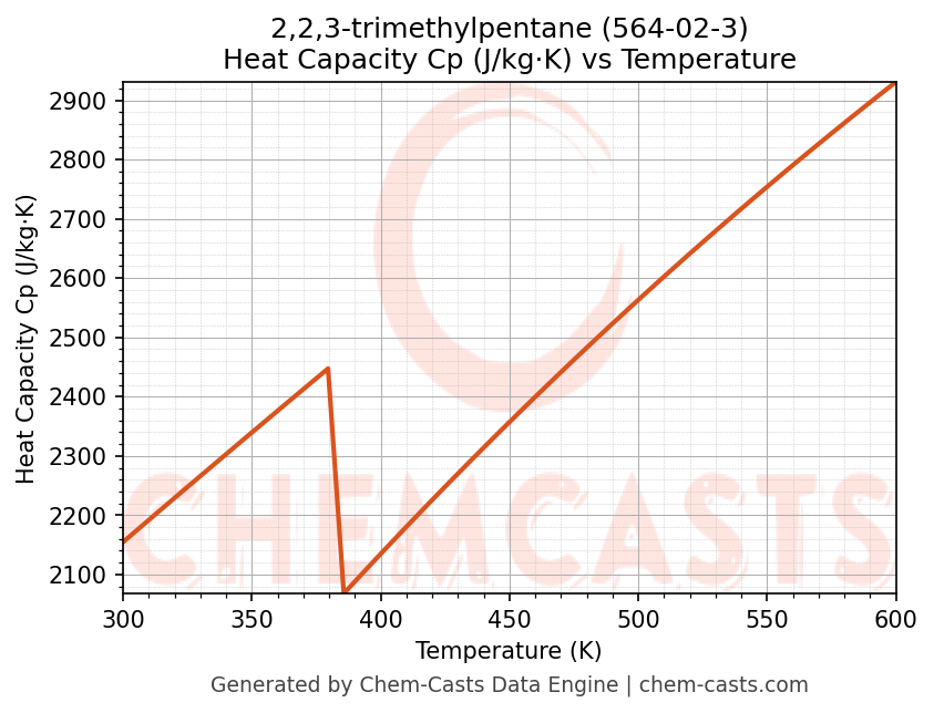 - Specific heat capacity (Cp) indicates the amount of energy required to raise the temperature of 2,2,3-trimethylpentane and is critical for energy balance and heat-exchanger design.