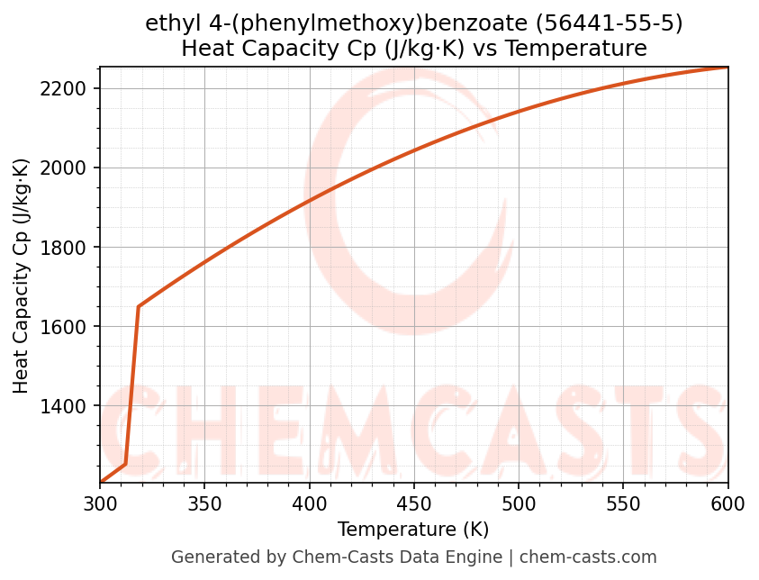 - Specific heat capacity (Cp) indicates the amount of energy required to raise the temperature of ethyl 4-(phenylmethoxy)benzoate and is critical for energy balance and heat-exchanger design.