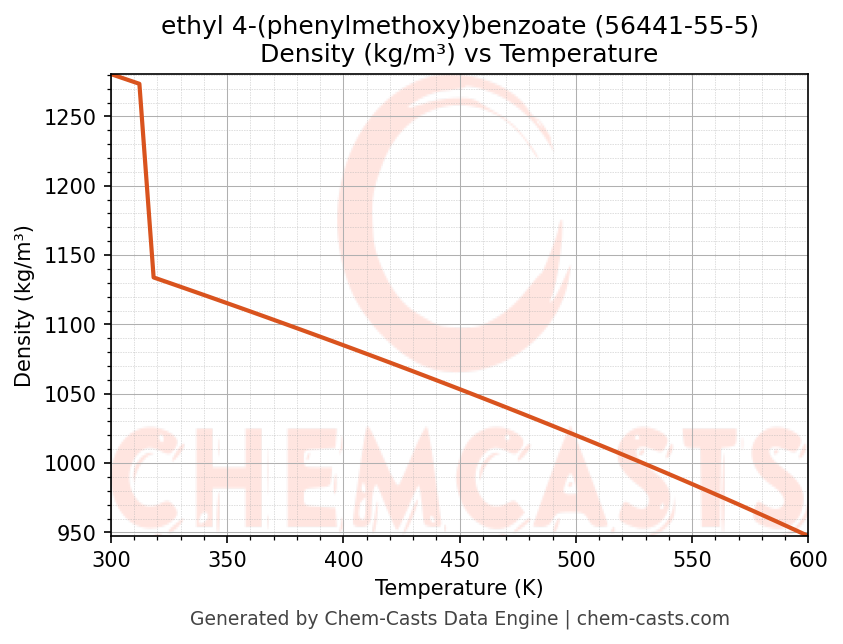This page presents the temperature-dependent thermodynamic and transport properties of ethyl 4-(phenylmethoxy)benzoate (CAS 56441-55-5) calculated at a constant pressure of 1 atm (101325 Pa) over the temperature range 250-500 K.
