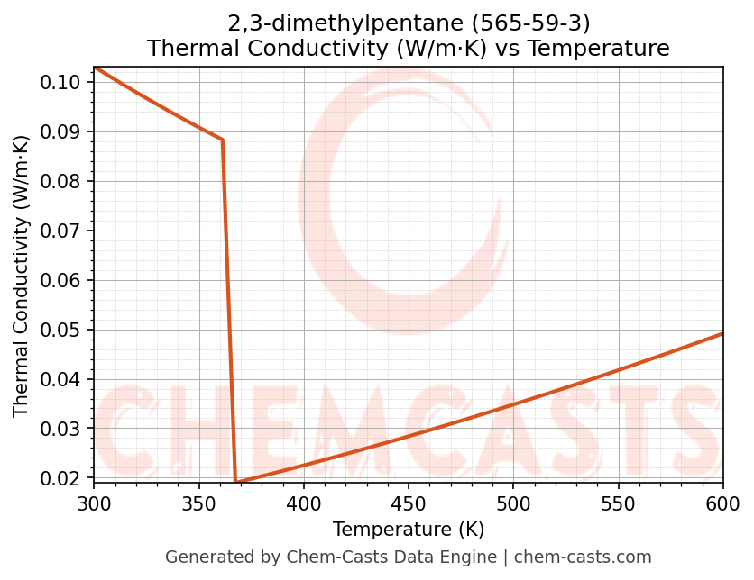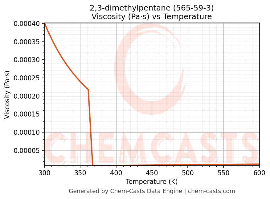 This page presents the temperature-dependent thermodynamic and transport properties of 2,3-dimethylpentane (CAS 565-59-3) calculated at a constant pressure of 1 atm (101325 Pa) over the temperature range 250-500 K.