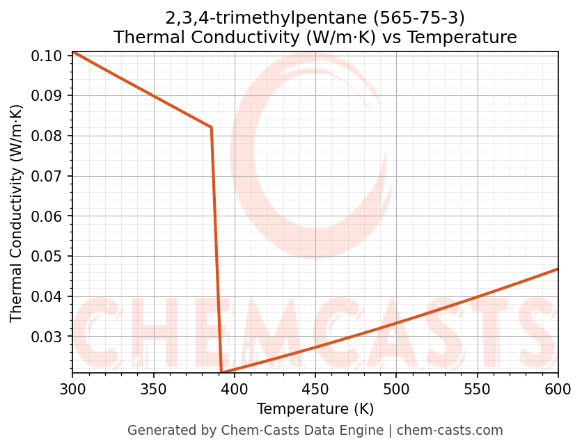 This page presents the temperature-dependent thermodynamic and transport properties of 2,3,4-trimethylpentane (CAS 565-75-3) calculated at a constant pressure of 1 atm (101325 Pa) over the temperature range 250-500 K.
