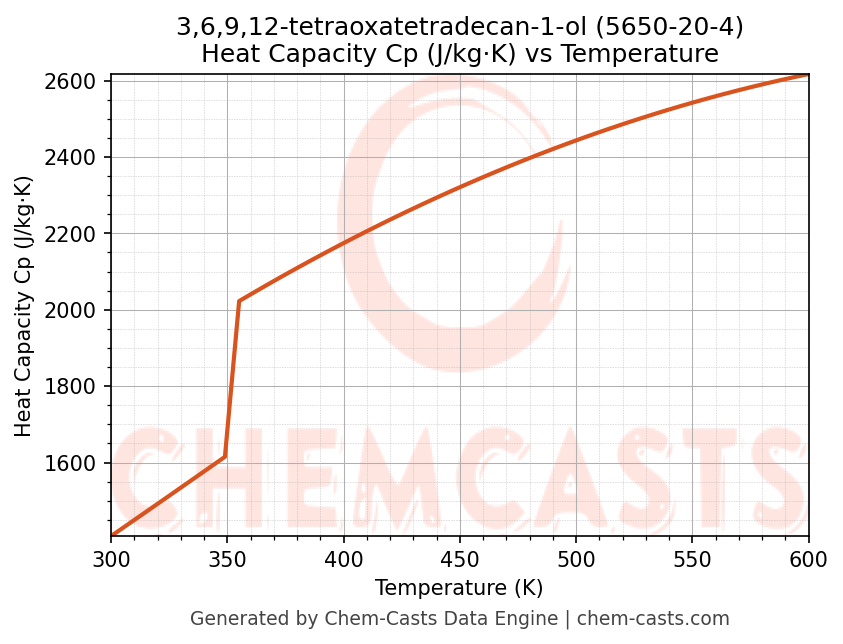 - Specific heat capacity (Cp) indicates the amount of energy required to raise the temperature of 3,6,9,12-tetraoxatetradecan-1-ol and is critical for energy balance and heat-exchanger design.