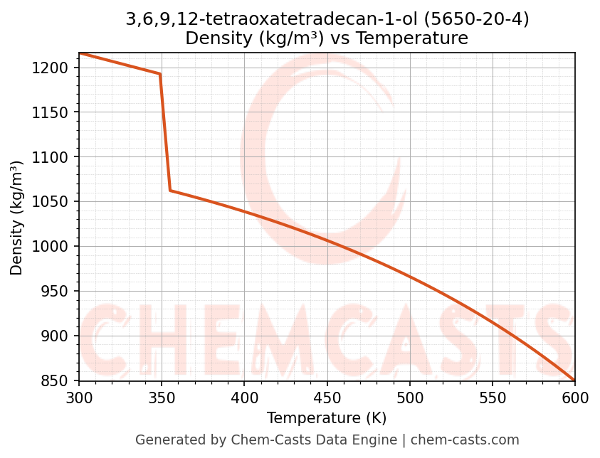 This page presents the temperature-dependent thermodynamic and transport properties of 3,6,9,12-tetraoxatetradecan-1-ol (CAS 5650-20-4) calculated at a constant pressure of 1 atm (101325 Pa) over the temperature range 250-500 K.