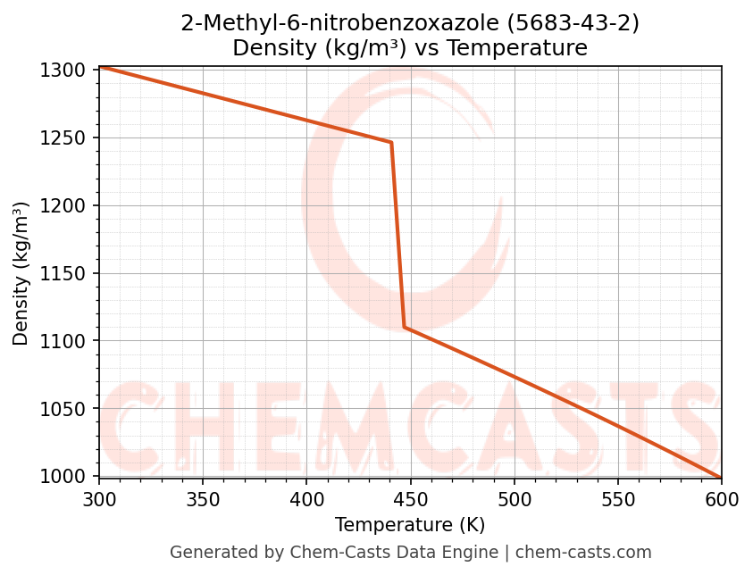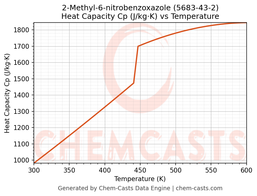 This page presents the temperature-dependent thermodynamic and transport properties of 2-Methyl-6-nitrobenzoxazole (CAS 5683-43-2) calculated at a constant pressure of 1 atm (101325 Pa) over the temperature range 250-500 K.