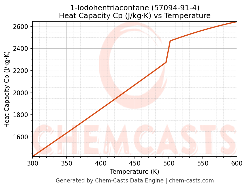 - Specific heat capacity (Cp) indicates the amount of energy required to raise the temperature of 1-Iodohentriacontane and is critical for energy balance and heat-exchanger design.