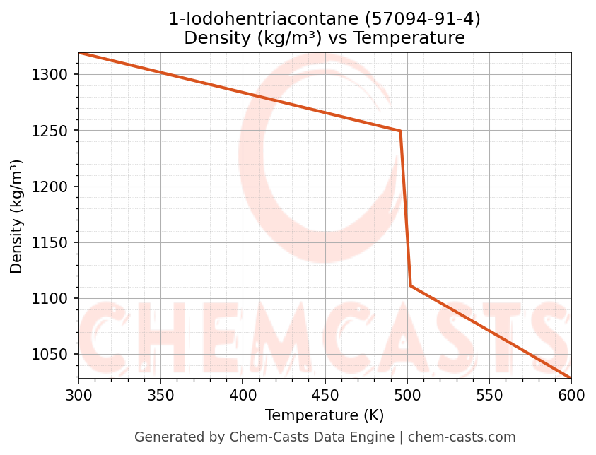This page presents the temperature-dependent thermodynamic and transport properties of 1-Iodohentriacontane (CAS 57094-91-4) calculated at a constant pressure of 1 atm (101325 Pa) over the temperature range 250-500 K.