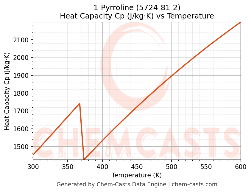 - Specific heat capacity (Cp) indicates the amount of energy required to raise the temperature of 1-Pyrroline and is critical for energy balance and heat-exchanger design.