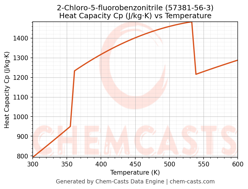 - Specific heat capacity (Cp) indicates the amount of energy required to raise the temperature of 2-Chloro-5-fluorobenzonitrile and is critical for energy balance and heat-exchanger design.