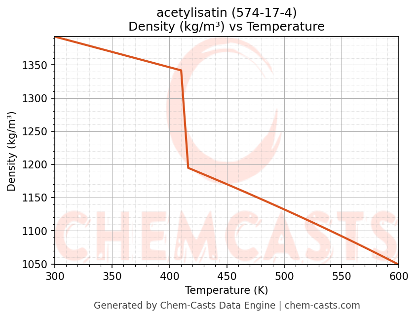 This page presents the temperature-dependent thermodynamic and transport properties of acetylisatin (CAS 574-17-4) calculated at a constant pressure of 1 atm (101325 Pa) over the temperature range 250-500 K.
