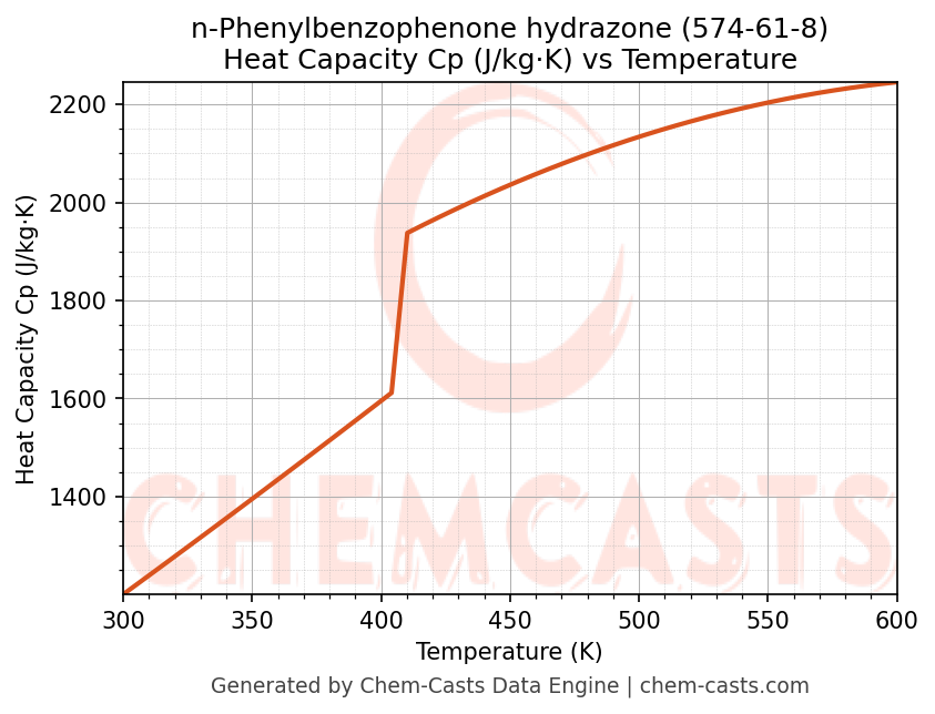 - Specific heat capacity (Cp) indicates the amount of energy required to raise the temperature of n-Phenylbenzophenone hydrazone and is critical for energy balance and heat-exchanger design.