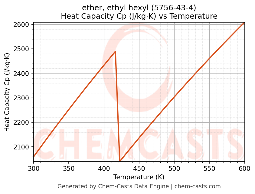 - Specific heat capacity (Cp) indicates the amount of energy required to raise the temperature of ether, ethyl hexyl and is critical for energy balance and heat-exchanger design.