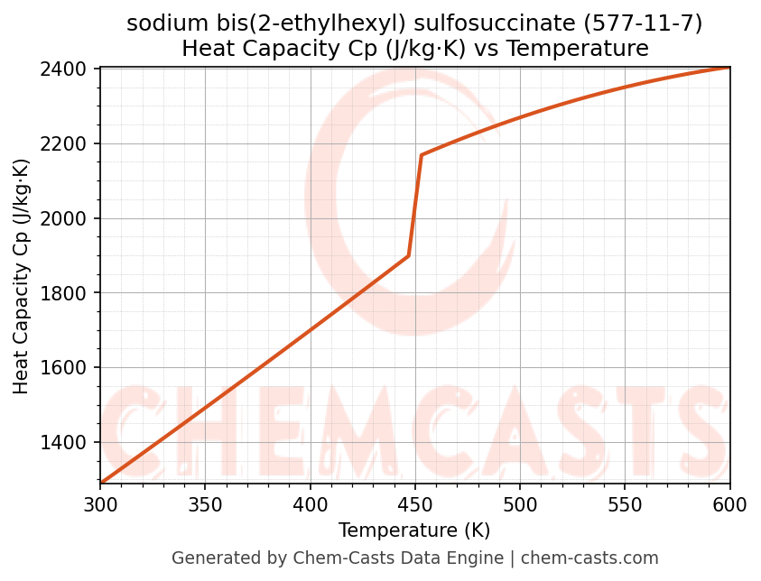- Specific heat capacity (Cp) indicates the amount of energy required to raise the temperature of sodium bis(2-ethylhexyl) sulfosuccinate and is critical for energy balance and heat-exchanger design.