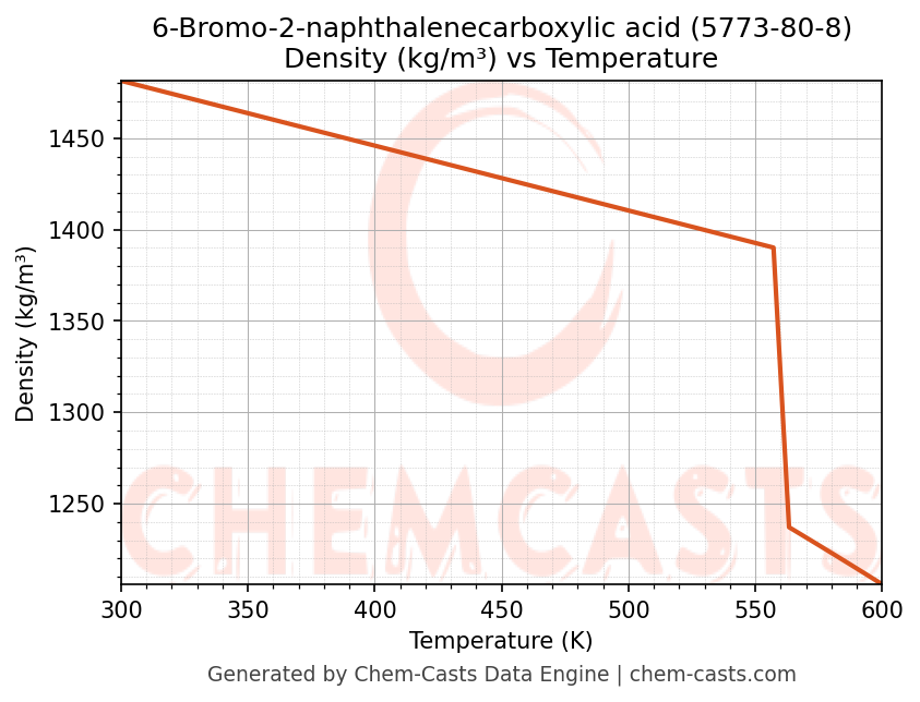 This page presents the temperature-dependent thermodynamic and transport properties of 6-Bromo-2-naphthalenecarboxylic acid (CAS 5773-80-8) calculated at a constant pressure of 1 atm (101325 Pa) over the temperature range 250-500 K.
