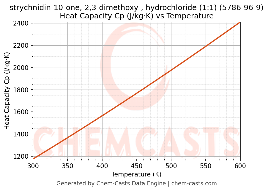 - Specific heat capacity (Cp) indicates the amount of energy required to raise the temperature of strychnidin-10-one, 2,3-dimethoxy-, hydrochloride (1:1) and is critical for energy balance and heat-exchanger design.