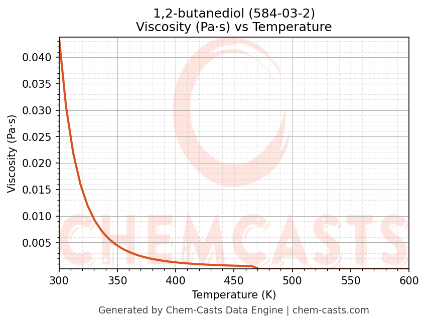 This page presents the temperature-dependent thermodynamic and transport properties of 1,2-butanediol (CAS 584-03-2) calculated at a constant pressure of 1 atm (101325 Pa) over the temperature range 250-500 K.