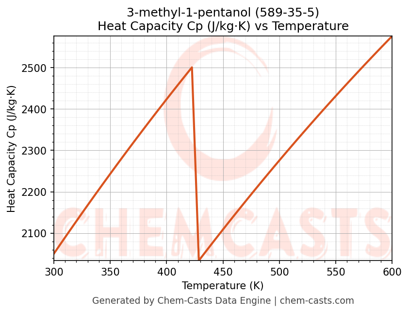 - Specific heat capacity (Cp) indicates the amount of energy required to raise the temperature of 3-methyl-1-pentanol and is critical for energy balance and heat-exchanger design.