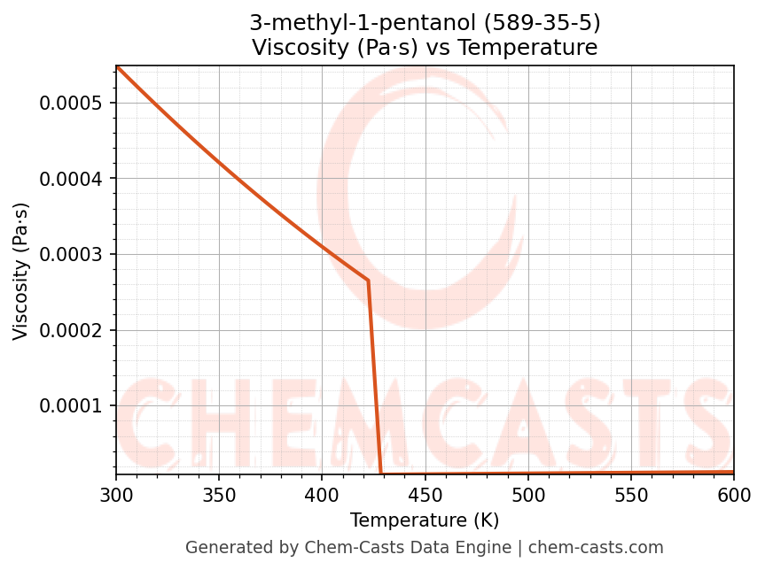 This page presents the temperature-dependent thermodynamic and transport properties of 3-methyl-1-pentanol (CAS 589-35-5) calculated at a constant pressure of 1 atm (101325 Pa) over the temperature range 250-500 K.
