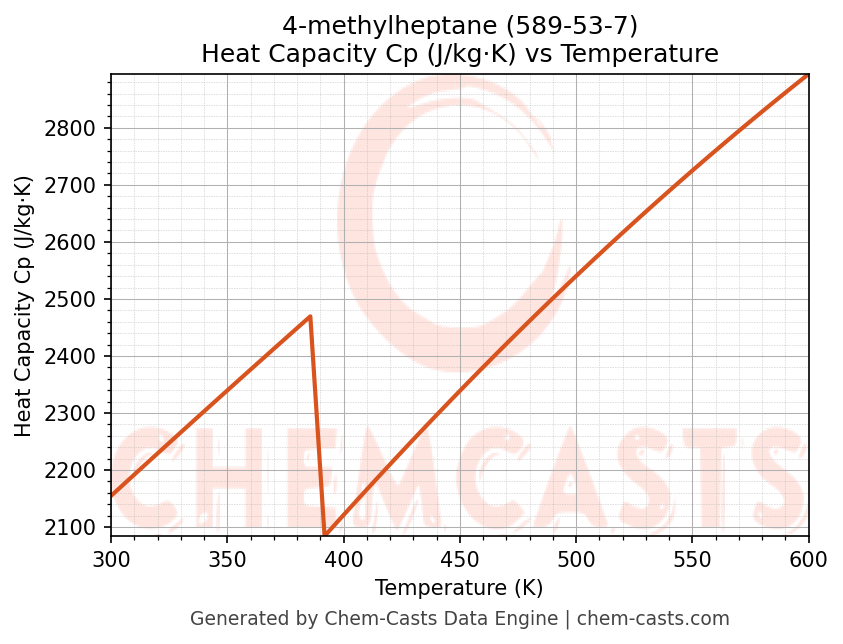 - Specific heat capacity (Cp) indicates the amount of energy required to raise the temperature of 4-methylheptane and is critical for energy balance and heat-exchanger design.