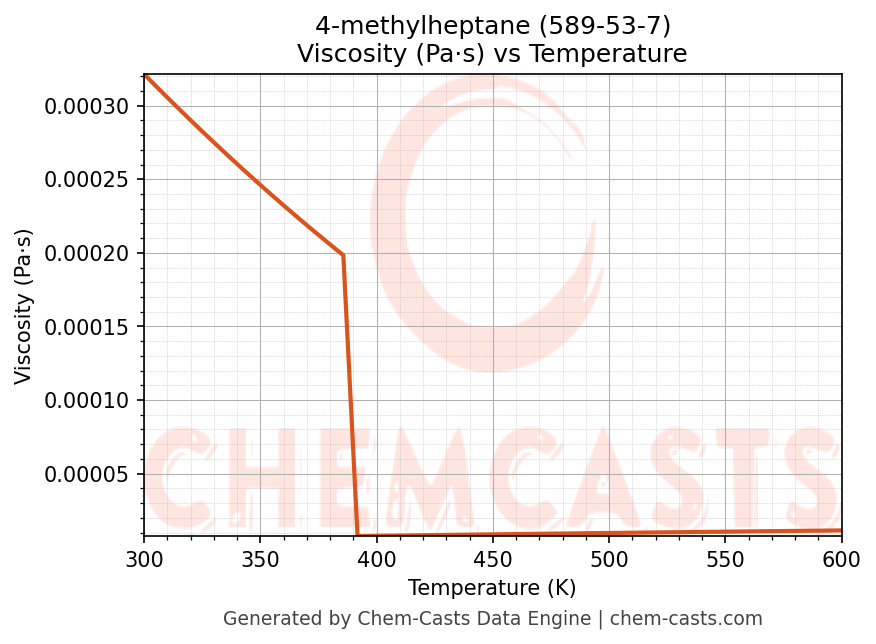 This page presents the temperature-dependent thermodynamic and transport properties of 4-methylheptane (CAS 589-53-7) calculated at a constant pressure of 1 atm (101325 Pa) over the temperature range 250-500 K.