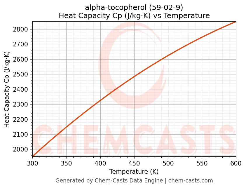 - Specific heat capacity (Cp) indicates the amount of energy required to raise the temperature of alpha-tocopherol and is critical for energy balance and heat-exchanger design.