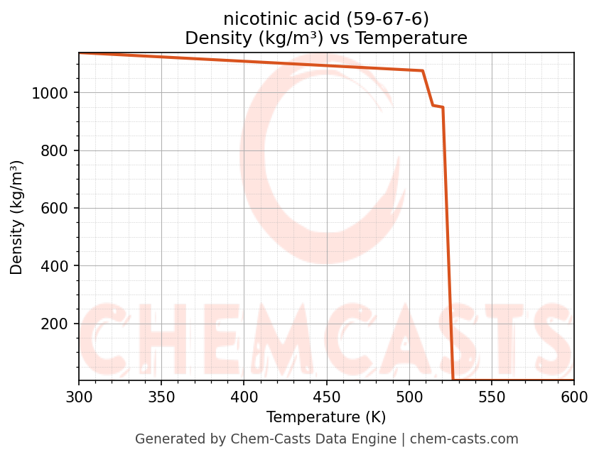 This page presents the temperature-dependent thermodynamic and transport properties of nicotinic acid (CAS 59-67-6) calculated at a constant pressure of 1 atm (101325 Pa) over the temperature range 250-500 K.