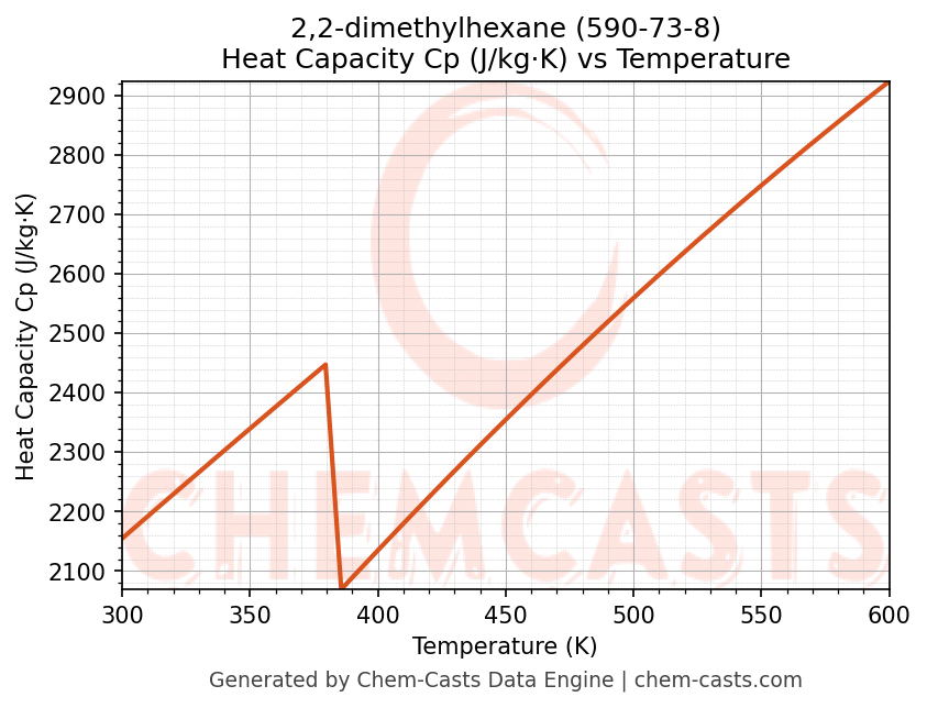 - Specific heat capacity (Cp) indicates the amount of energy required to raise the temperature of 2,2-dimethylhexane and is critical for energy balance and heat-exchanger design.