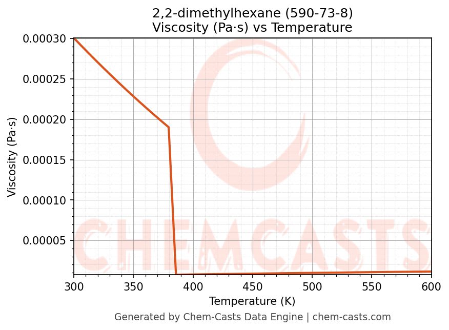 This page presents the temperature-dependent thermodynamic and transport properties of 2,2-dimethylhexane (CAS 590-73-8) calculated at a constant pressure of 1 atm (101325 Pa) over the temperature range 250-500 K.