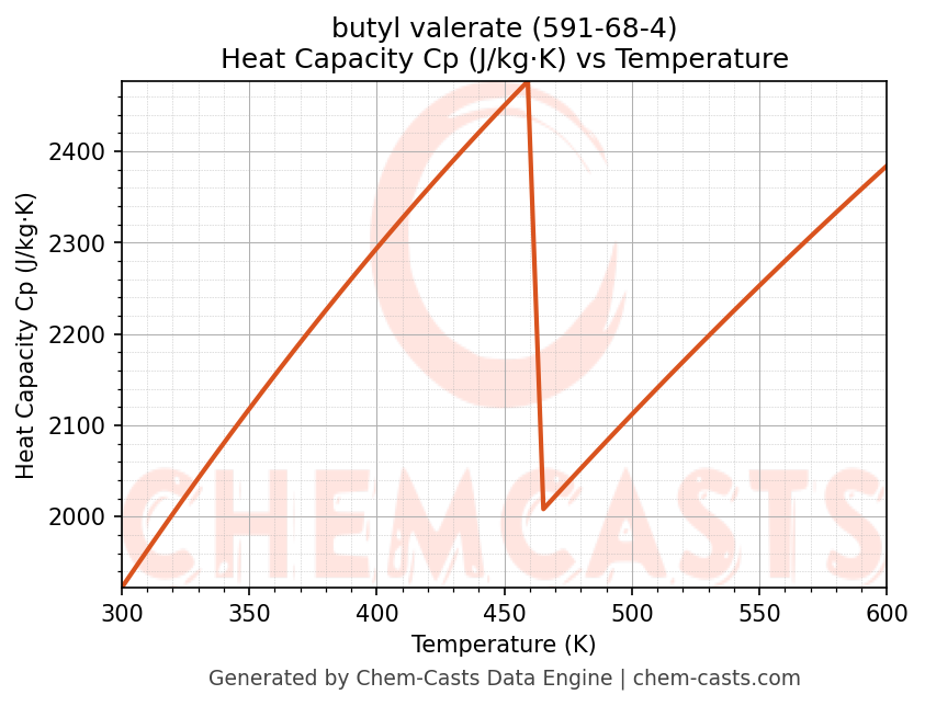 - Specific heat capacity (Cp) indicates the amount of energy required to raise the temperature of butyl valerate and is critical for energy balance and heat-exchanger design.