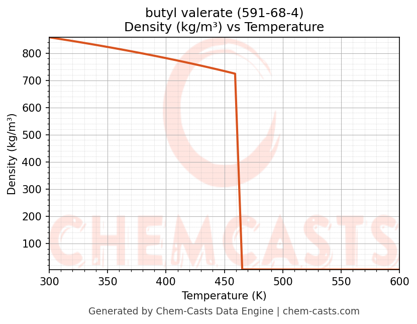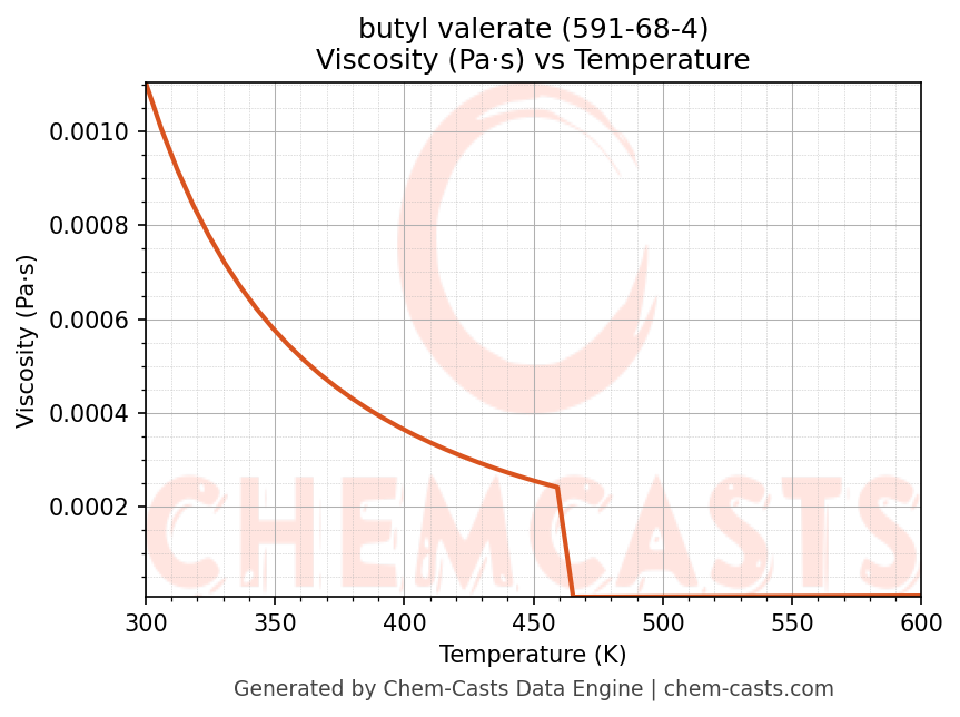 This page presents the temperature-dependent thermodynamic and transport properties of butyl valerate (CAS 591-68-4) calculated at a constant pressure of 1 atm (101325 Pa) over the temperature range 250-500 K.