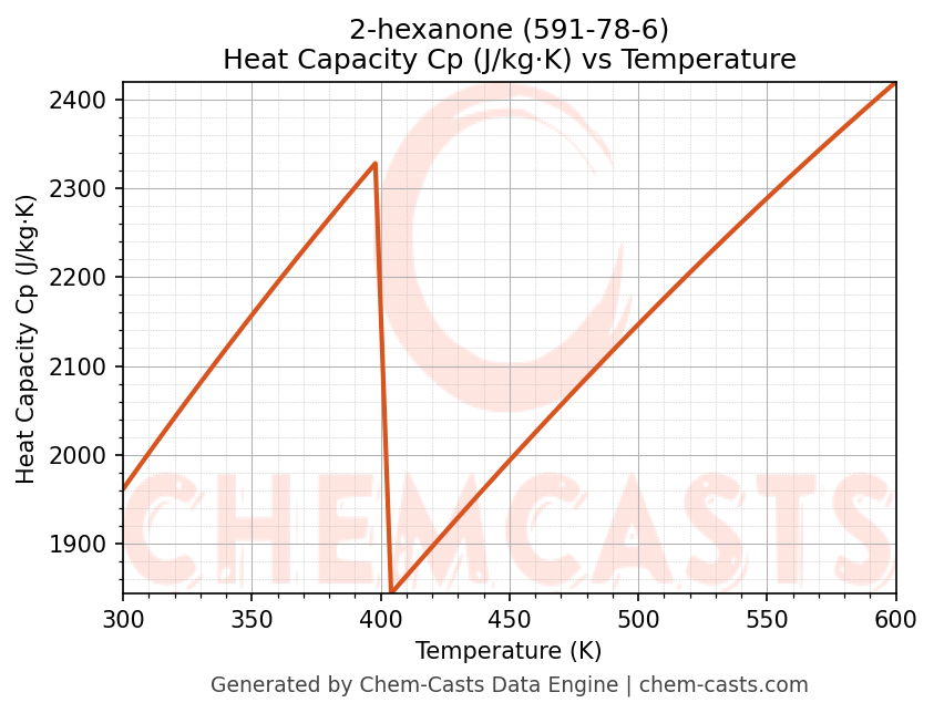 - Specific heat capacity (Cp) indicates the amount of energy required to raise the temperature of 2-hexanone and is critical for energy balance and heat-exchanger design.