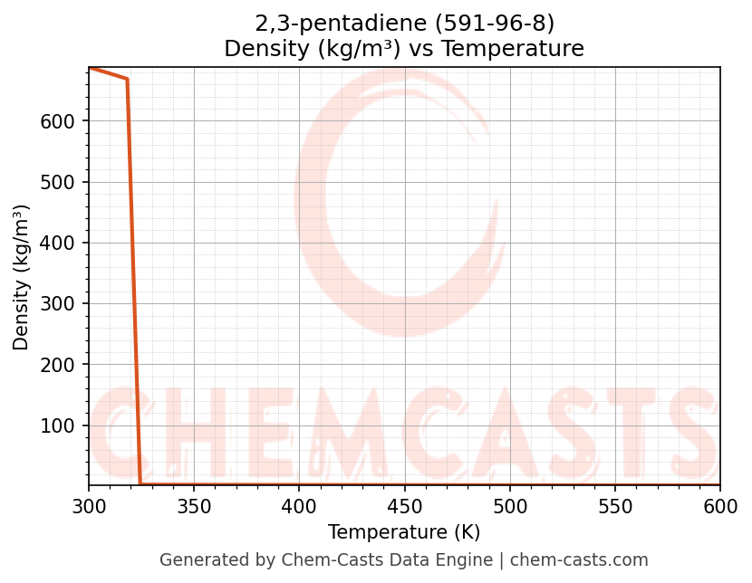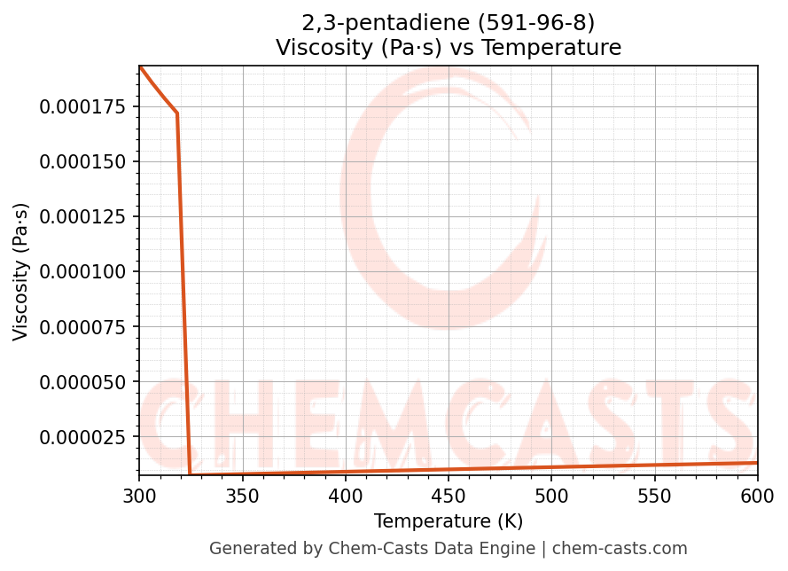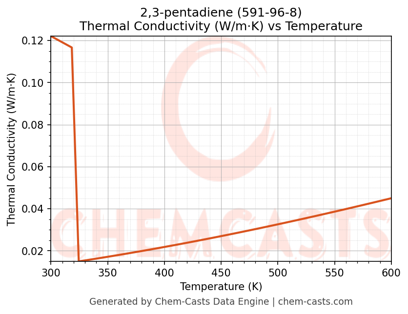 This page presents the temperature-dependent thermodynamic and transport properties of 2,3-pentadiene (CAS 591-96-8) calculated at a constant pressure of 1 atm (101325 Pa) over the temperature range 250-500 K.