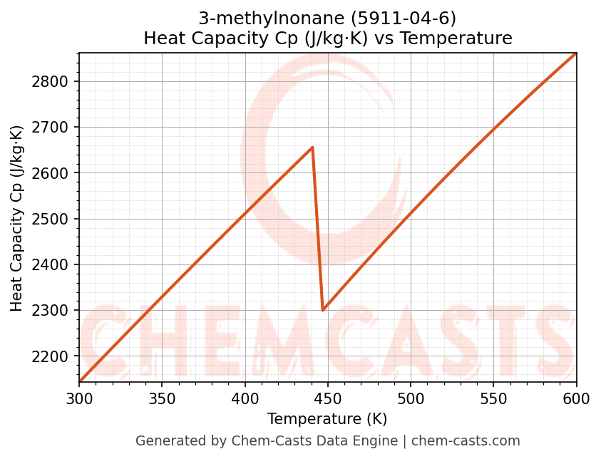 - Specific heat capacity (Cp) indicates the amount of energy required to raise the temperature of 3-methylnonane and is critical for energy balance and heat-exchanger design.