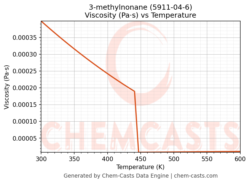 This page presents the temperature-dependent thermodynamic and transport properties of 3-methylnonane (CAS 5911-04-6) calculated at a constant pressure of 1 atm (101325 Pa) over the temperature range 250-500 K.
