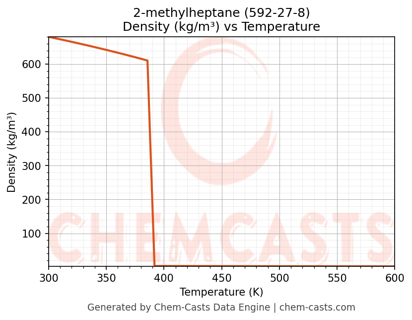 This page presents the temperature-dependent thermodynamic and transport properties of 2-methylheptane (CAS 592-27-8) calculated at a constant pressure of 1 atm (101325 Pa) over the temperature range 250-500 K.