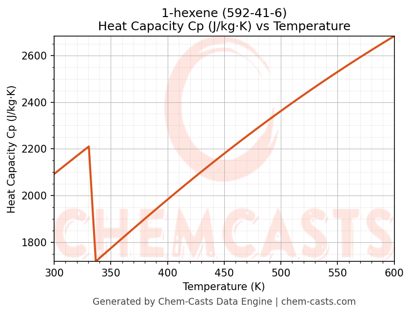 - Specific heat capacity (Cp) indicates the amount of energy required to raise the temperature of 1-hexene and is critical for energy balance and heat-exchanger design.