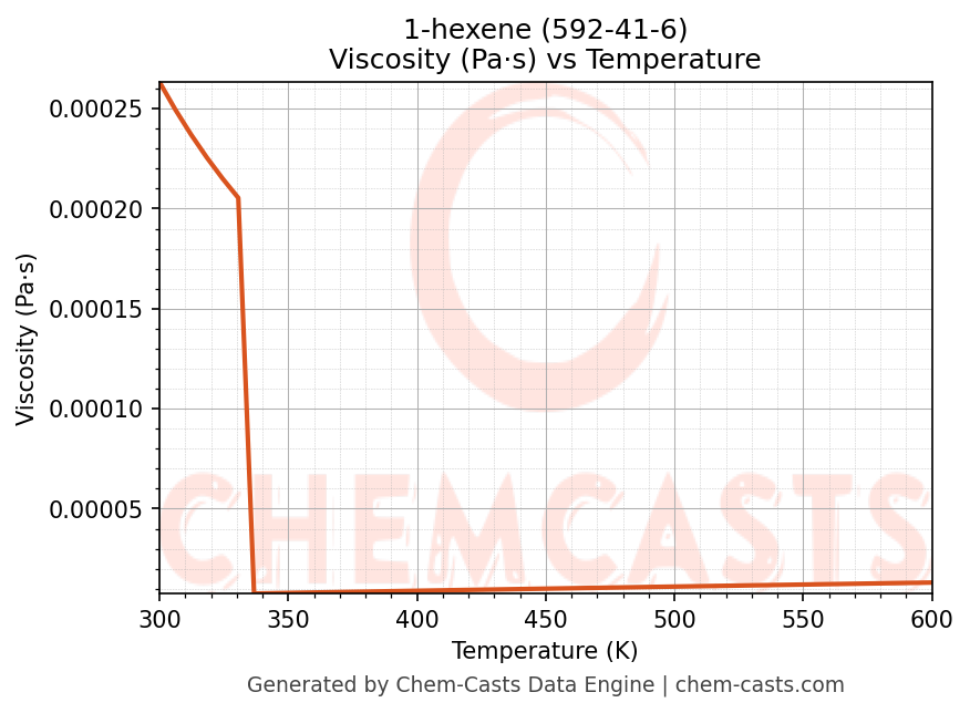 This page presents the temperature-dependent thermodynamic and transport properties of 1-hexene (CAS 592-41-6) calculated at a constant pressure of 1 atm (101325 Pa) over the temperature range 250-500 K.